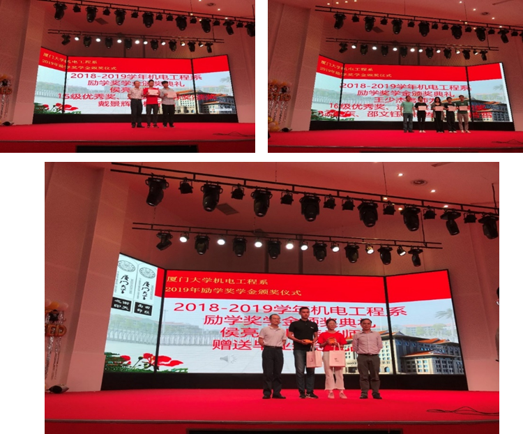 机电工程系2018-2019学年励学奖学金的颁奖典礼在欢歌笑语中进行,王凌云副教授为颁奖典礼致辞并宣读了获奖名单。侯亮教授、周伟教授、王凌云副教授、陈松月副教授、秦利锋副教授、连云崧助理教授、王少杰助理教授、王坤老师分别为各级励学优秀奖学金及进步奖学金的获得者颁发了获奖证书,激励机电学子学习榜样的力量再接再厉登上新台阶。典礼最后,侯亮教授和周伟教授向15级的班委代表发放具有机电特色的毕业纪念水晶印章。纪念印章中间为镂空状,希望踏上新征程的机电学子们的心中能始终记得机电这个大家庭,一步一个脚印、踏踏实实地走好未来的每一段旅程。