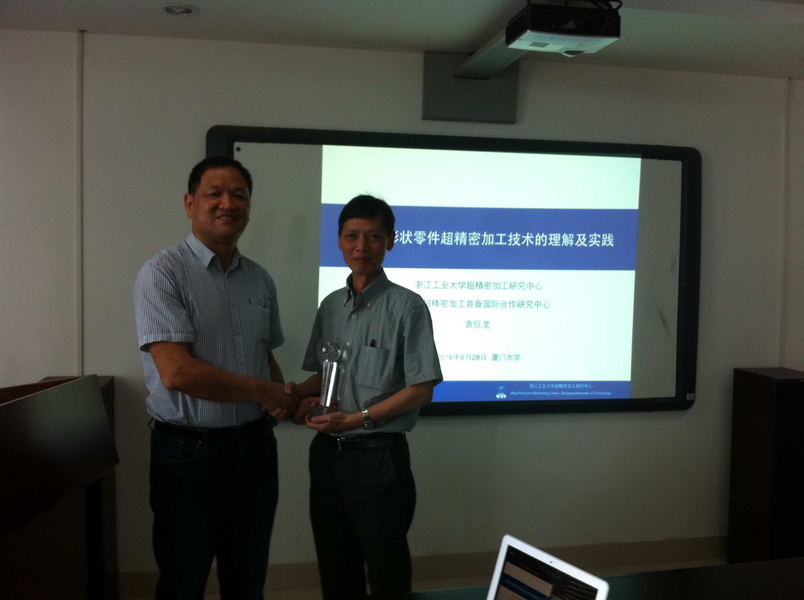 最后,学院党委书记洪永强教授为袁巨龙教授颁发了凌云讲座的奖杯,由衷感谢袁教授莅临我校进行学术交流。袁教授用丰富详实的图文数据、成熟深刻的探索研究为我系师生献上了一场精彩纷呈的学术讲座。