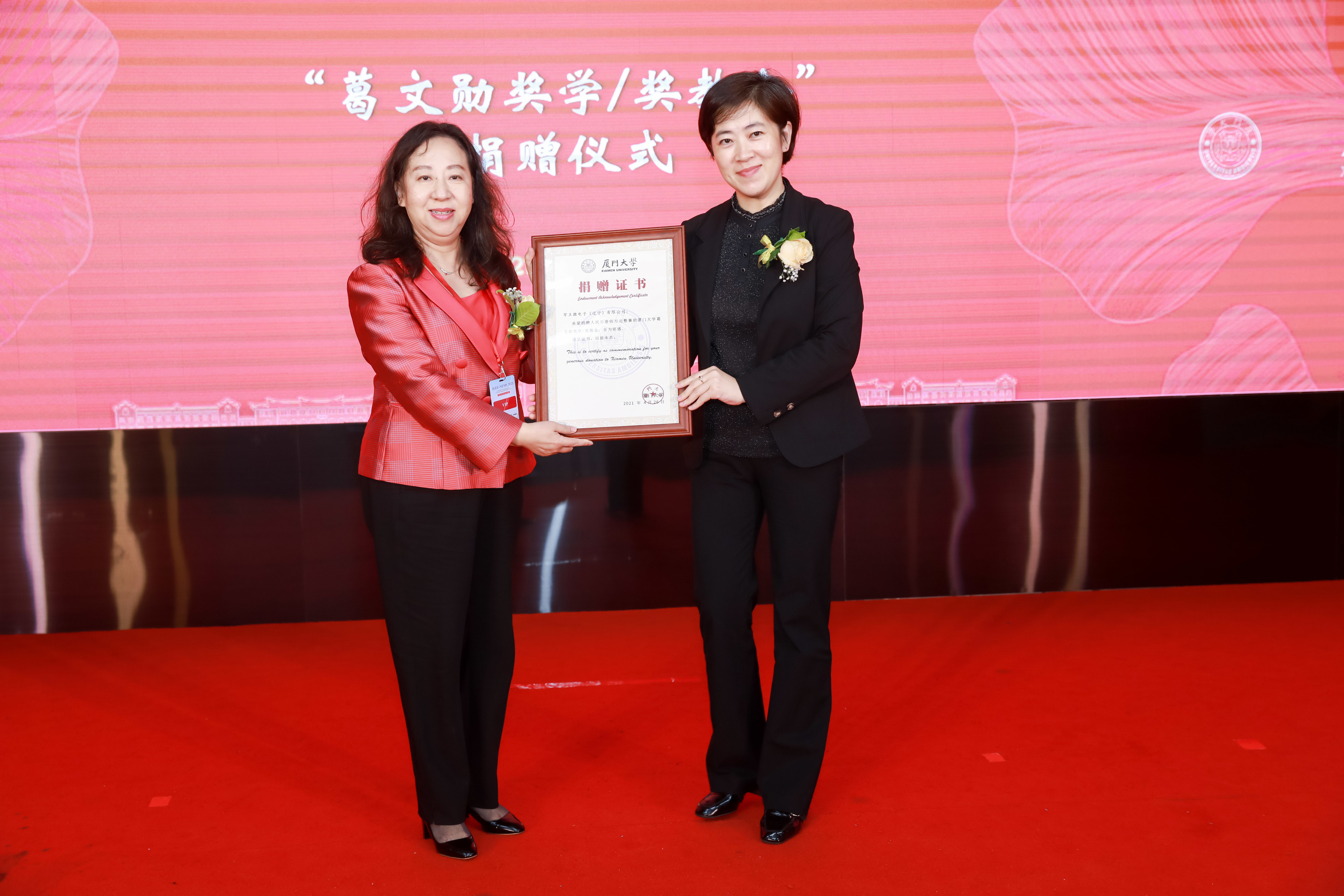 在启动仪式上,校长助理陈光、蒋庄德院士、田中群院士、孙世刚院士、张海霞教授、孙道恒教授为“葛文勋奖学/奖教金”启动仪式点灯,将熊熊火种传与青年一代。就如,葛文勋先生在纪念萨本栋校长的手稿《点灯》中写道:“想要一盏小灯,引来许多的灯,照亮年轻一代的心灵,让他们把这灯光传下去”。随后,葛文勋先生弟子、罕王微电子(辽宁)有限公司董事长黄向向捐赠100万元人民币用于设立葛文勋奖学奖教金,厦门大学教育发展基金会赵晓慧副秘书长为黄向向颁发捐赠证书。