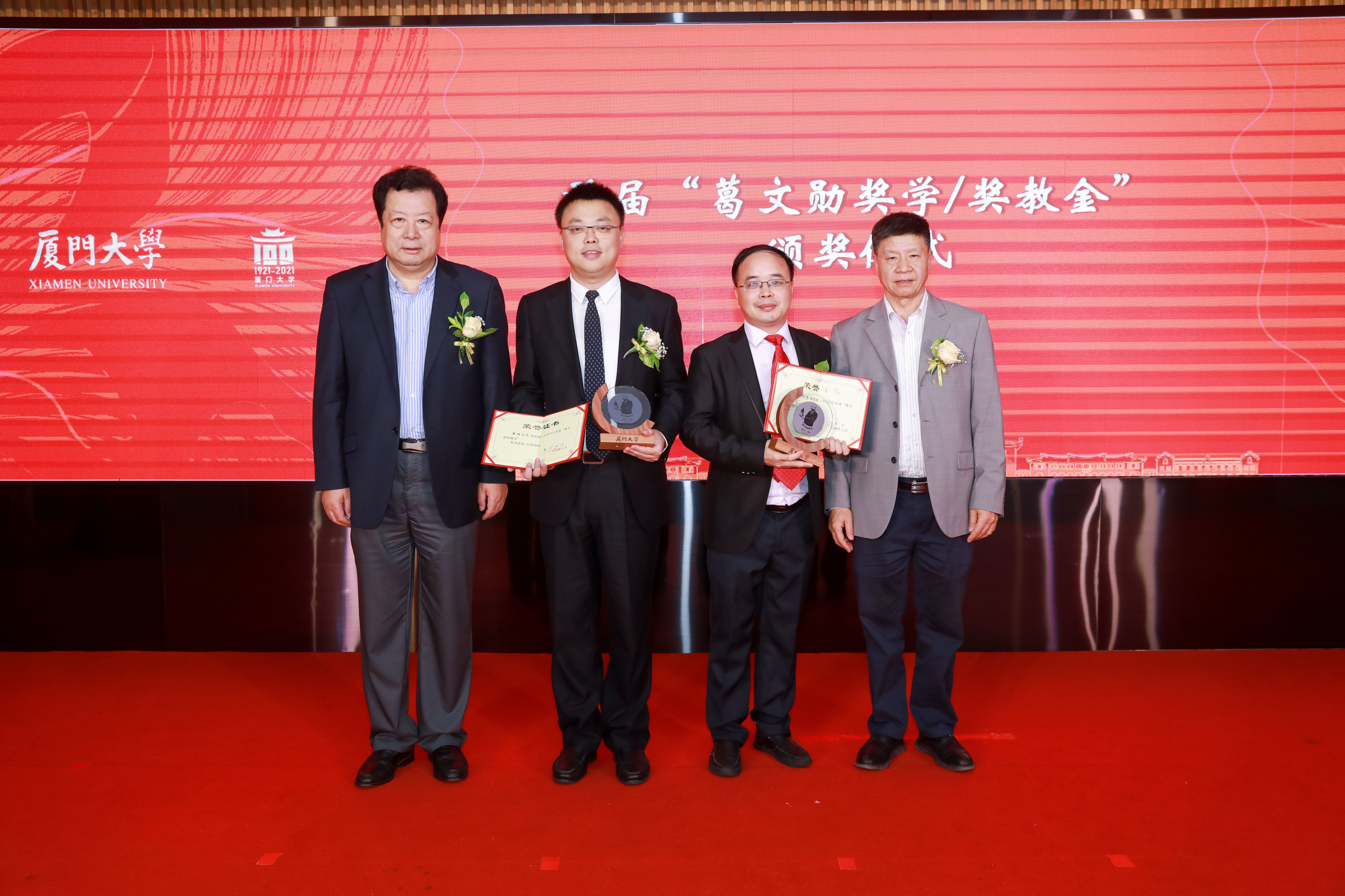 在颁奖仪式上,孙世刚院士代表由蒋庄德院士、郭东明院士、刘明院士、田中群院士、郑兰荪院士、孙世刚院士等顶尖专家组成的首届“葛文勋奖学/奖教金”评审专家委员会宣布首届“葛文勋奖教金”获奖人侯旭教授和周伟教授,首届“葛文勋奖学金”获奖人何浩、詹昊霖和金航同学。由特邀嘉宾为获奖人颁发奖状和由硅片制成的奖杯,获奖教师代表周伟教授表示将传承先生精神,就如先生所说以一盏灯引来更多的灯照亮一片,获奖学生代表金航发言到吾辈定当更加努力为新中国建设奉献力量。