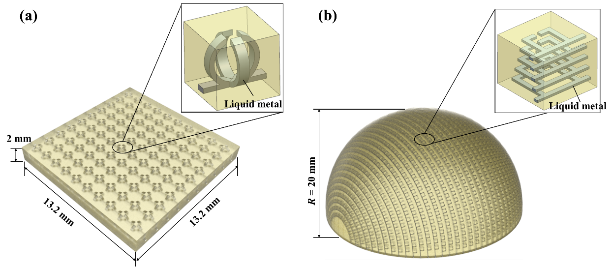 该研究将3D打印的灵活性与液态金属的易流动、易填充性相结合,开辟了一类复杂微结构制造新方法,为结构-功能一体化柔性电子、软体机器人、天线等富含多材料、跨尺度结构的制造奠定了基础。也为拓展超材料应用范围(如3D光学/电磁隐身衣、智能蒙皮、超透镜等) 提供了新的解决方案。