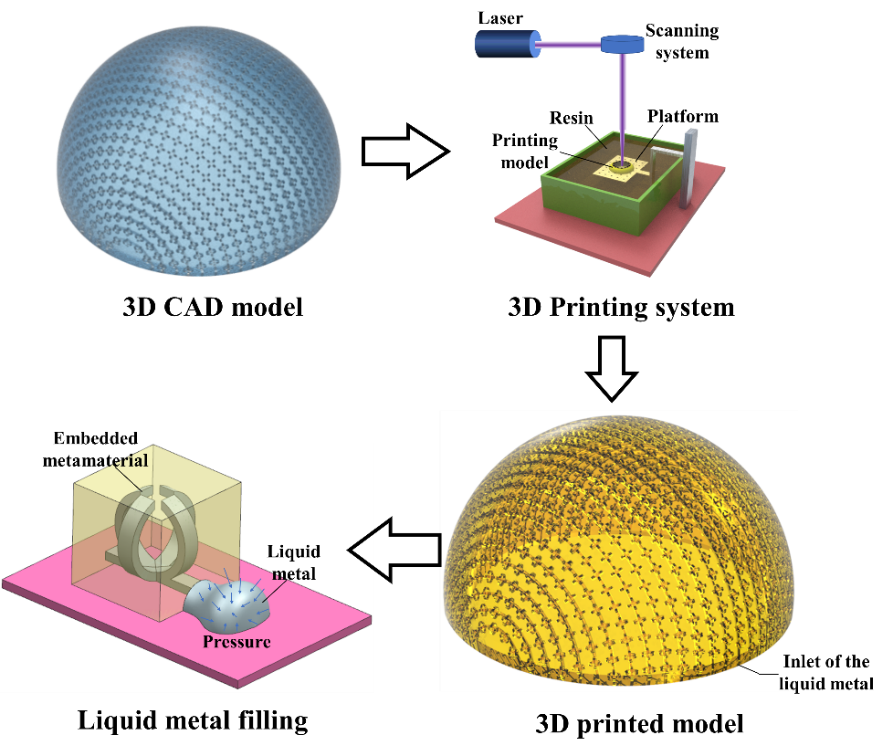 采用高精度光固化3D打印含有超材料微结构空腔的复杂宏观结构,填充液态金属制备金属导电超材料微结构。