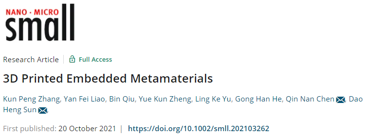 近日,厦门大学航空航天学院孙道恒教授带领的科研团队提出“微尺度3D打印+液态金属填充”方法,突破了多材料(聚合物-金属)、跨尺度(μm~cm)、共形、结构-功能一体化微结构增材制造技术,为富含这类共性特征器件的结构创新、功能创新及应用创新奠定基础。以3D复杂电磁超材料为对象验证了工艺的鲁棒性及有效性,通过优化液态金属填充流道布局及表面后处理工艺提升了超材料器件的传输性能。相关工作以题为“3D Printed Embedded Metamaterials”发表于国际期刊Small (https://doi.org/10.1002/smll.202103262,IF:13.281)上。