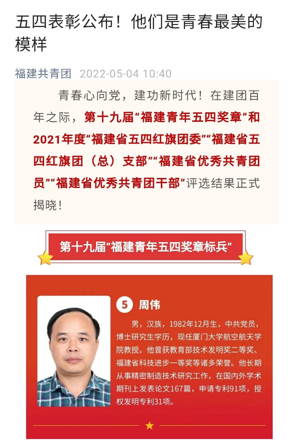 青春心向党,建功新时代!在建团百年之际,第十九届“福建青年五四奖章”评选结果揭晓! 厦门大学航空航天学院副院长、机电工程系周伟教授荣获第十九届“福建青年五四奖章标兵”称号。