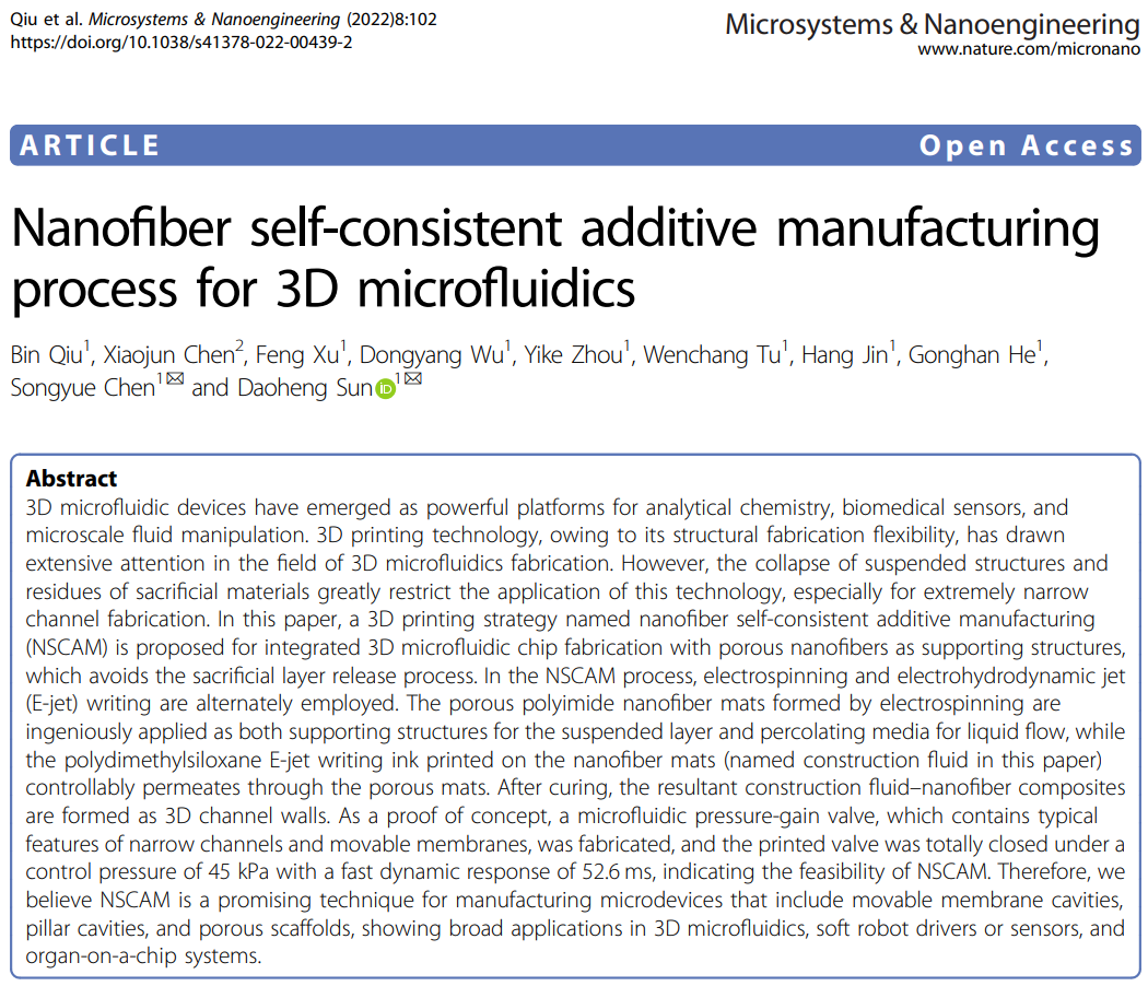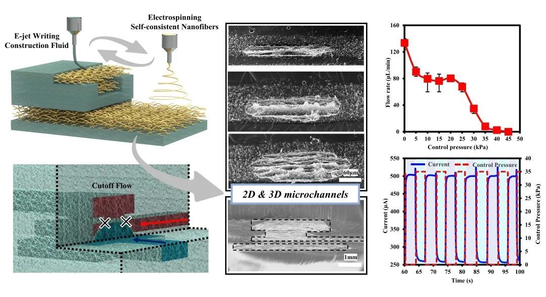 作者提出了一种实用的增材制造策略,称为纳米纤维自支撑增材制造(NSCAM)方法,通过交替使用静电纺丝和电流体动力射流(E-jet)直接制造3D微流体。NSCAM基于电纺纳米纤维的自支撑效应和多孔化结构特性,创新性的将纳米纤维用作悬垂结构打印的支撑层和工作流体的渗流介质。通过直写墨水在纳米纤维中的可控渗透,形成图案化的3D通道壁。整个制造过程可以实现一体化制备3D微流体芯片,同时避免了去牺牲层和对准键合流程。作为演示,本文制作并测试了一个典型的3D流体微阀,该阀具有3D微流体通道、悬臂式结构和可动膜结构,验证了本方法的可行性和优势性。