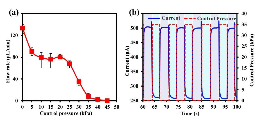 在输入流道中以135μL/h的流量通入流体,随着控制流道中压力的升高(0~10kpa),输出流道的流量降低,这主要是由于纳米纤维的压缩。接着提高控制压力,由于纳米纤维的压缩程度有限,输出流速响应存在一个压力不应期(即10 ~20 kPa之间),这有利于稳定输出流量在~80μL/min。截止压力出现在45 kPa,这时纳米纤维膜被极大压缩,可被视为无孔隙薄膜,并在压力作用下偏转将连接层流道完全堵塞。为了评估阀门的动态性能,将KCL溶液通入输入流道,并在流路中施加12V电压。当控制压力从0 kPa上升到35 kPa时,连接层流道过流截面减小,电流值从500μA下降到250μA,压力负载和电流变化之间的延迟约为52.6 ms。接着对阀门开展了频率为0.15 Hz的循环测试,在高于100次重复加载-卸载测试中未见结构失效。