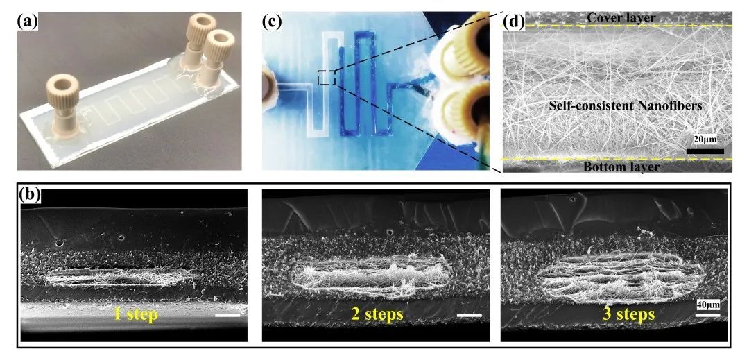 图2: 含自支撑纳米纤维的二维微流体器件。(a)微流控芯片;(b)在流体通道层制备过程中,分别交替进行1次、2次和3次静电纺丝和静电直写以创建不同高度的单层微流体通道;(c) 工作流体通过含自支撑纳米纤维的微通道;(d)含自支撑纳米纤维的微通道截面。