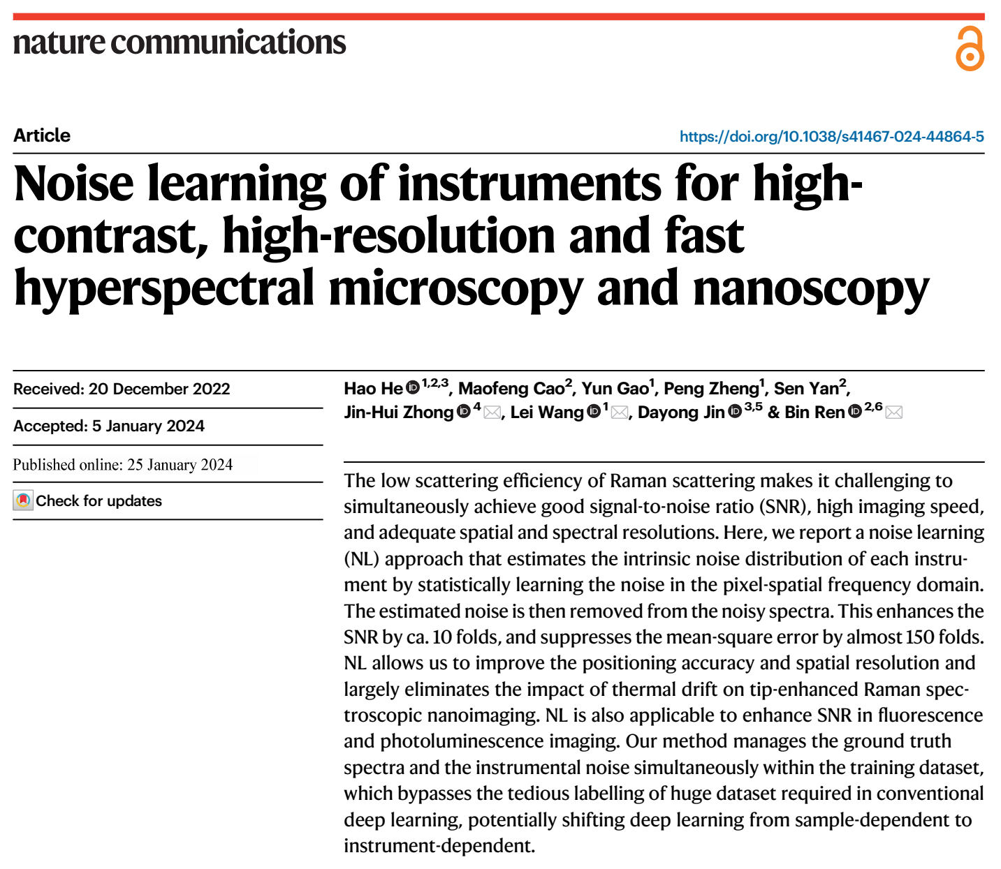 文章 | He H., Cao M.F., Gao Y., Zheng P., Yan S., Zhong J.H., Wang L.; Jin D.Y., Ren B. Noise learning of instruments for high-contrast, high-resolution and fast hyperspectral microscopy and nanoscopy. Nat Commun. 15, 754 (2024). https://doi.org/10.1038/s41467-024-44864-5.