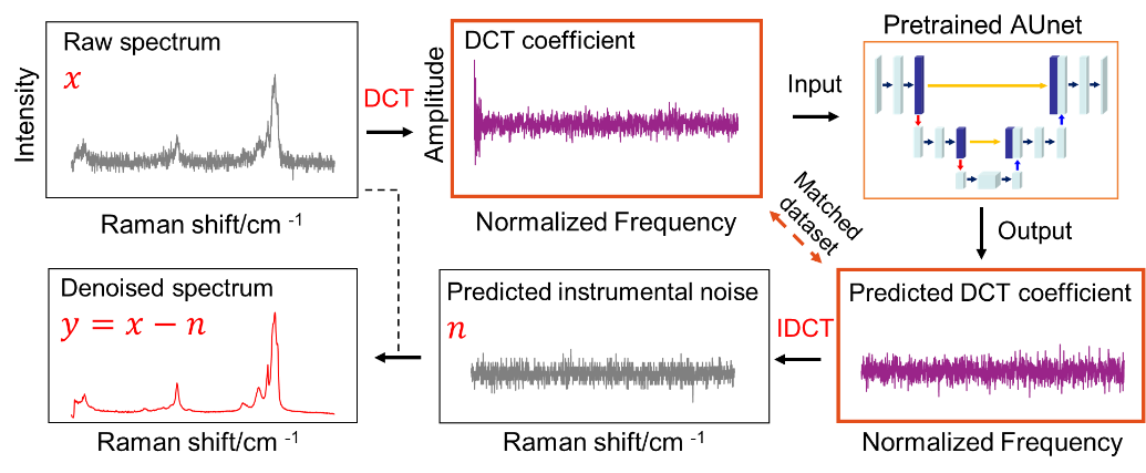 拉曼光谱是一种分子“指纹”技术,具有无标记、无损伤、分子特异性等优点,是重要的生物研究手段。但受到固有低拉曼散射效率的影响,光谱信噪比较低。常常需要增加积分时间或者功率来获得高质量的信号,这显而易见会降低生物样本活性。因此,对信号去噪是一种获得高质量的信号的常用手段。目前主流的去噪方法一种是基于信号处理的方法,但依赖于专家经验,导致应用场景具有较多的限制;另一种是基于深度学习的方法,从大量标记的数据中学习到目标数据的特征,从而实现精准预测。但需要庞大的标注数据,且不同物质的拉曼光谱形态各异,其信号强度、信噪比水平也因不同实验条件各异,客观上增加了使用深度学习技术的难度,导致其通用性差。这两种主流方法都忽略了在测试过程中,仪器本身带来的影响,尤其是低信噪比条件下,仪器噪声是主要的噪声来源。因此,如何直接从根本上有效识别仪器噪声并去扣除,还是一项未曾探索过的挑战。