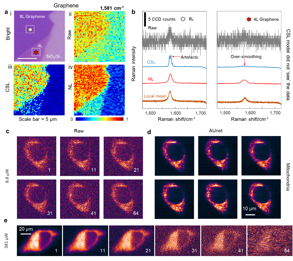 研究人员展示了NL在光谱学场景中的应用。如图2 a-b,对比了NL与其他方法对低信噪比的石墨烯的成像和光谱,NL方法对“未见”样本表现最好。随后,还展示了在线扫描显微镜对活细胞的荧光成像的应用结果(图2 c-e),将荧光成像的激光功率降低了43倍,有助于对易损生物样品进行长期监测,减少光诱导损伤。