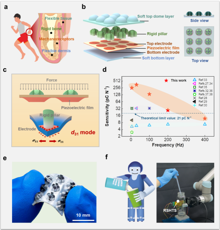 该研究工作最初受节肢动物结构组成的启发,提出了一种基于刚柔并济“三明治”结构(图1a, b)的超灵敏高频动态力检测的仿生型柔性触觉传感器。该结构设计不仅可提升柔性材料的力传递效率,而且由于刚柔并济力传递层与柔性下基体的结合使得压电层产生弯曲应变,从而使得柔性触觉传感器工作在新的模式——d31(图1c),颠覆了传统的压电式柔性触觉传感器的d33工作模式。正是由于传感器的工作模式的转变,使得该柔性触觉传感器的灵敏度得到显著提升(约为346.5 pCN-1,达到理论极限值的17倍)(图1d),且具有5−600 Hz宽带宽、0.009−4.3 N线性检测范围和实时力方向识别的优异性能。特别是,尽管由于该柔性触觉传感器引入了刚性阵列结构,但通过刚柔并济结构的优化设计,使得该柔性触觉传感器具有与传统柔性触觉传感器相媲美的可弯曲、可拉伸特性(图1e),并最后将柔性触觉传感器成功用于精确检测机器人的多种灵巧操作的动态信息(图1f)。