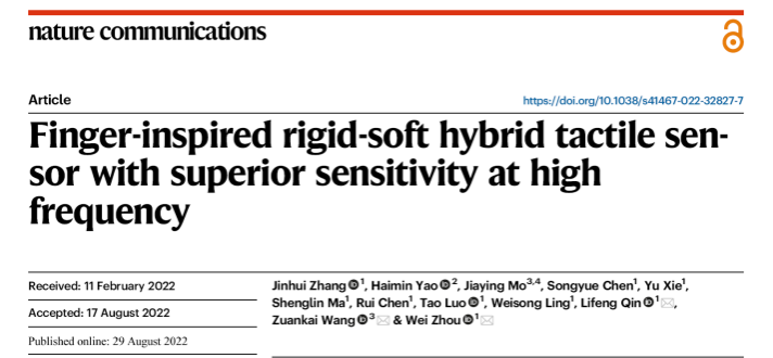 近日,厦门大学航空航天学院机电工程系周伟教授团队在柔性触觉传感器研究领域取得重要进展,提出了可以实现超灵敏高频动态力检测的柔性触觉传感器工作新模式,突破了传感器灵敏度的理论极限值并得到显著提升,相关研究成果以“Finger-inspired rigid-soft hybrid tactile sensor with superior sensitivity at high frequency”为题,以厦门大学为第一署名单位,于2022年8月29日在线发表在Nature Communications期刊(DOI : 10.1038/s41467-022-32827-7)。