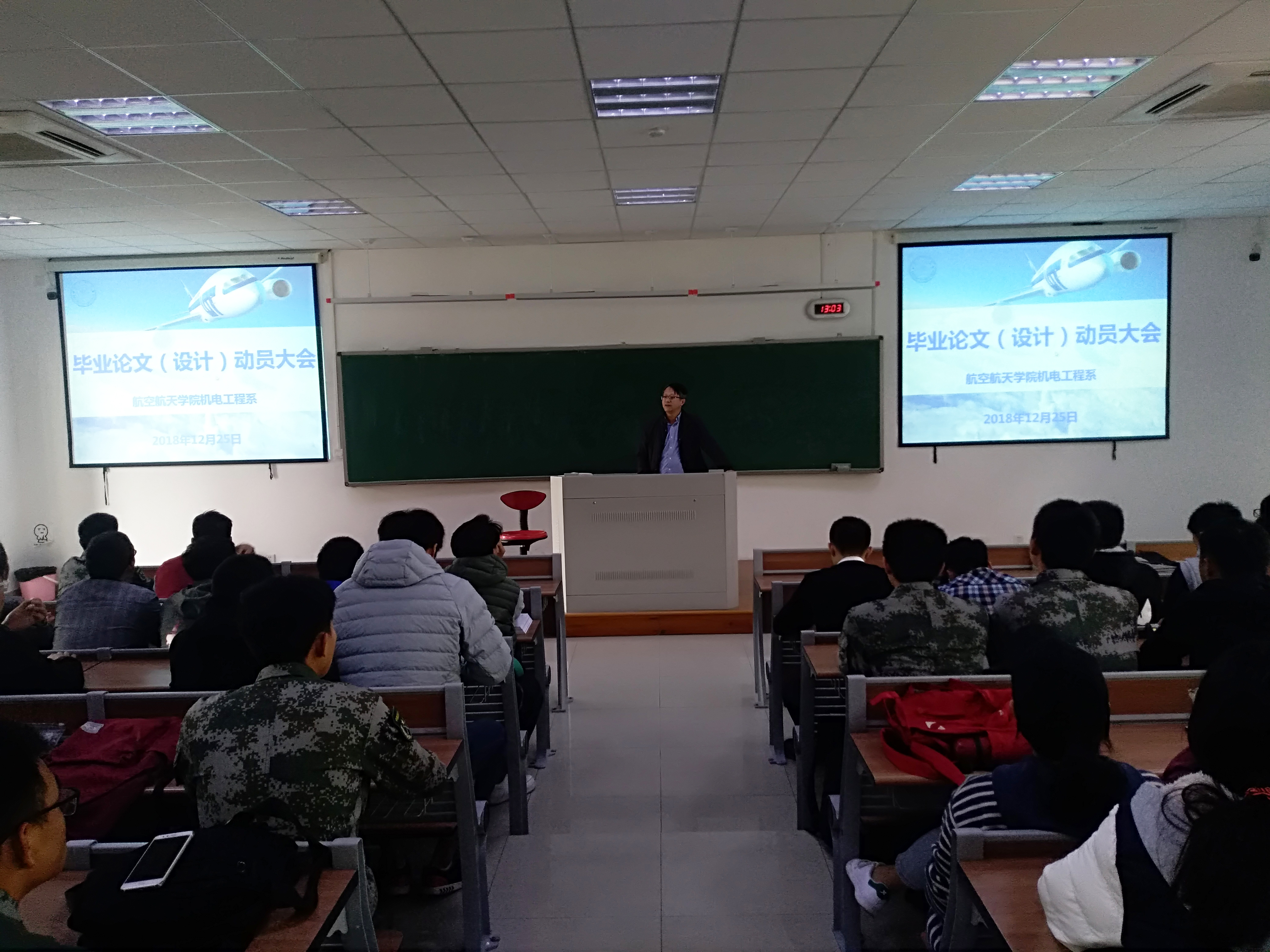 2018年12月25日下午13点, 机电工程系2015级本科生毕业论文(设计)动员大会于学武楼C105顺利举行。机电工程系王凌云副教授、2015级机械设计制造及其自动化专业学生参与本次动员大会。