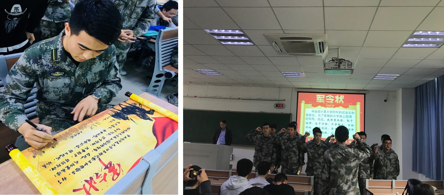 最后,国防生代表2015级机械设计制造及其自动化专业的学生签署了军令状并宣誓:“毕业设计是大学四年的试金石和检验石,为了给我的大学画上圆满的句号,在此,我郑重承诺:勤于询师,忠于行动,只争朝夕,目标所向,绝不退让,全力以赴,使命必达,特此立状,以表决心。”